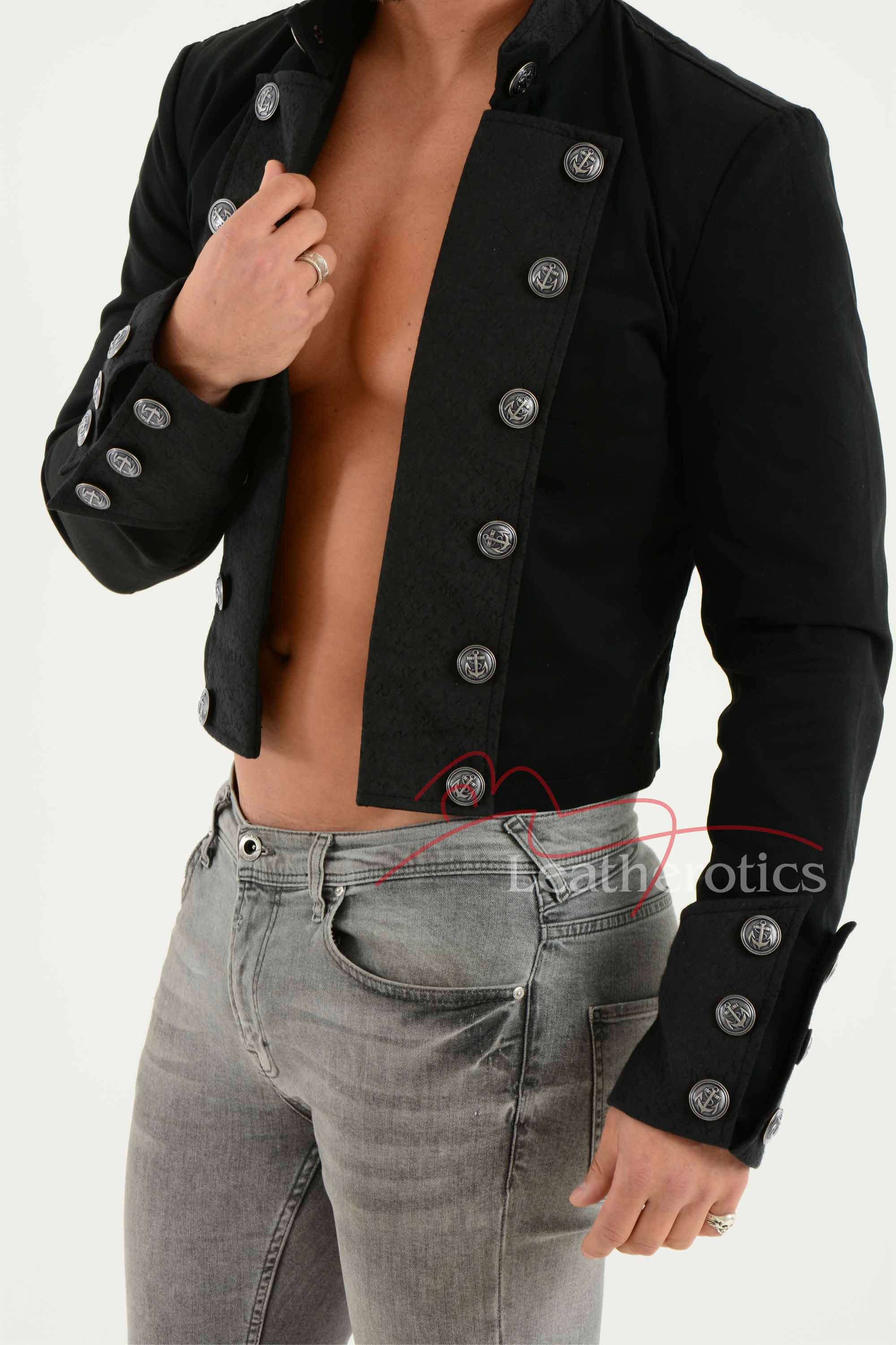 A European cut short jacket from the old country. An awesome jacket made in black color. Antique double headed metal buttons. Fully lined in sleek black satin. Comes in sizes S to 5XL.