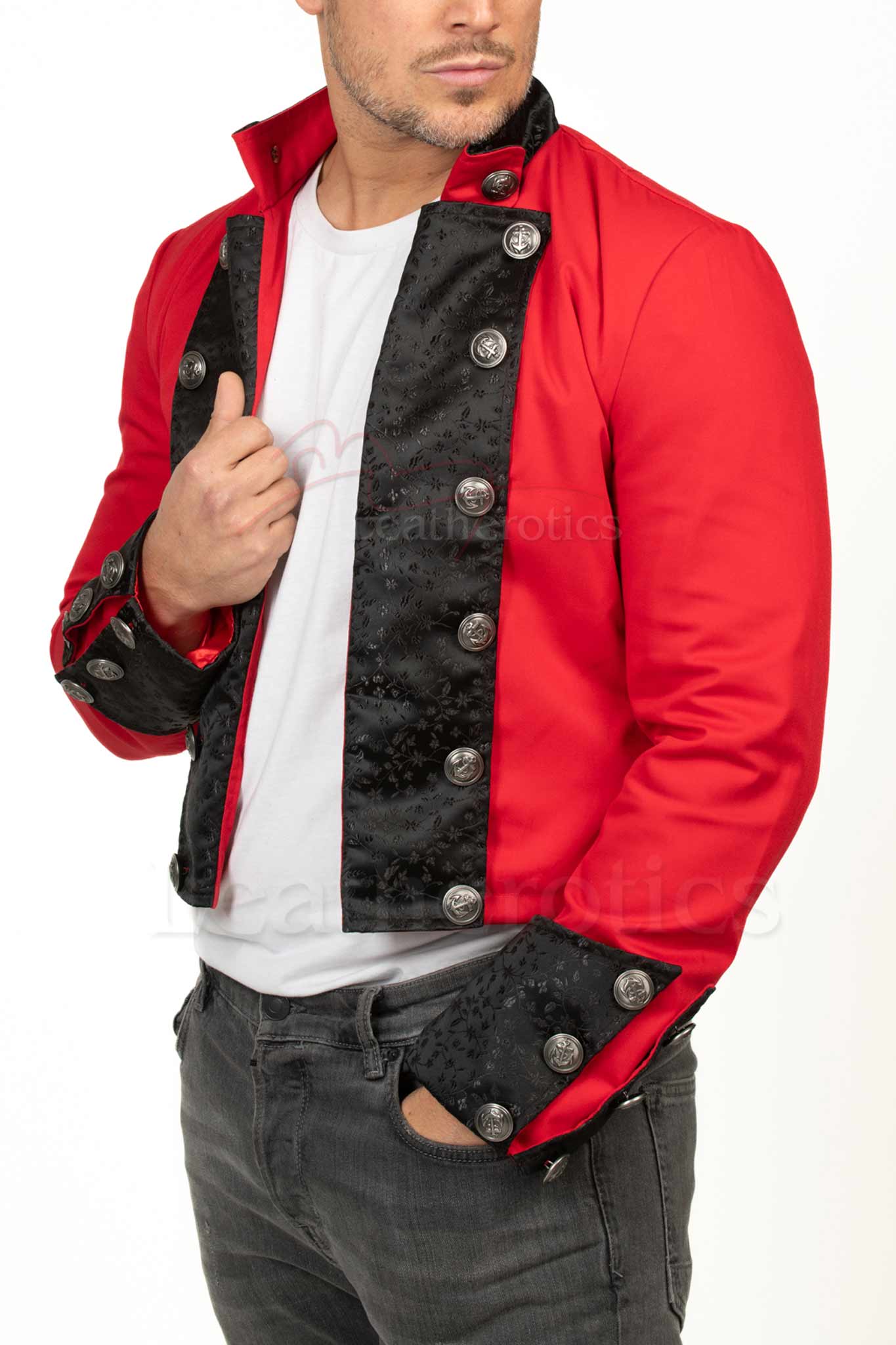 Featuring elegant red brocade on the lapel and cuffs, this piece adds a refined yet bold touch to any look.