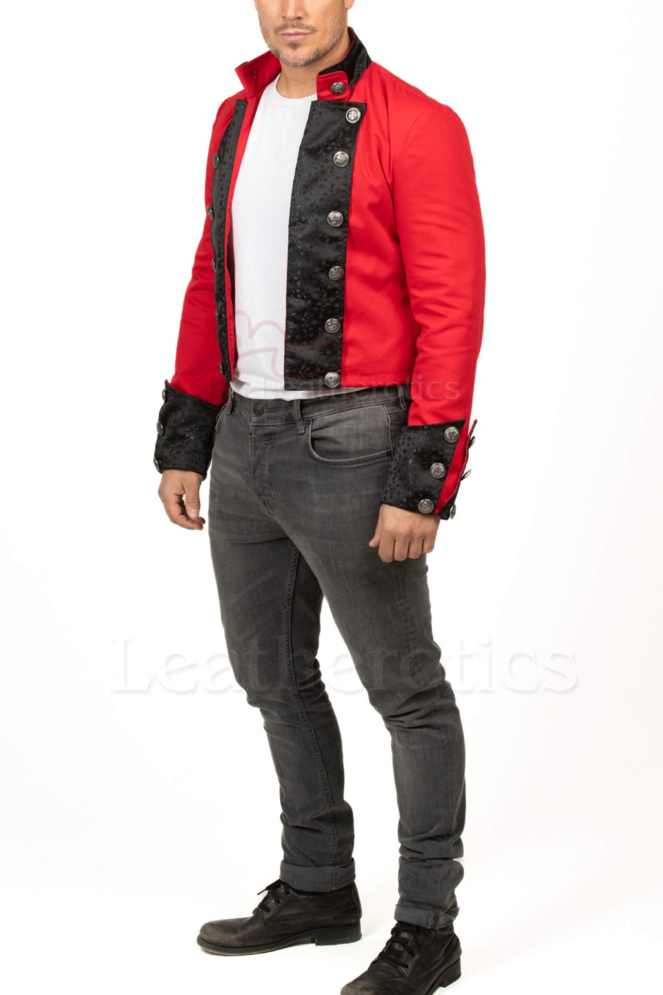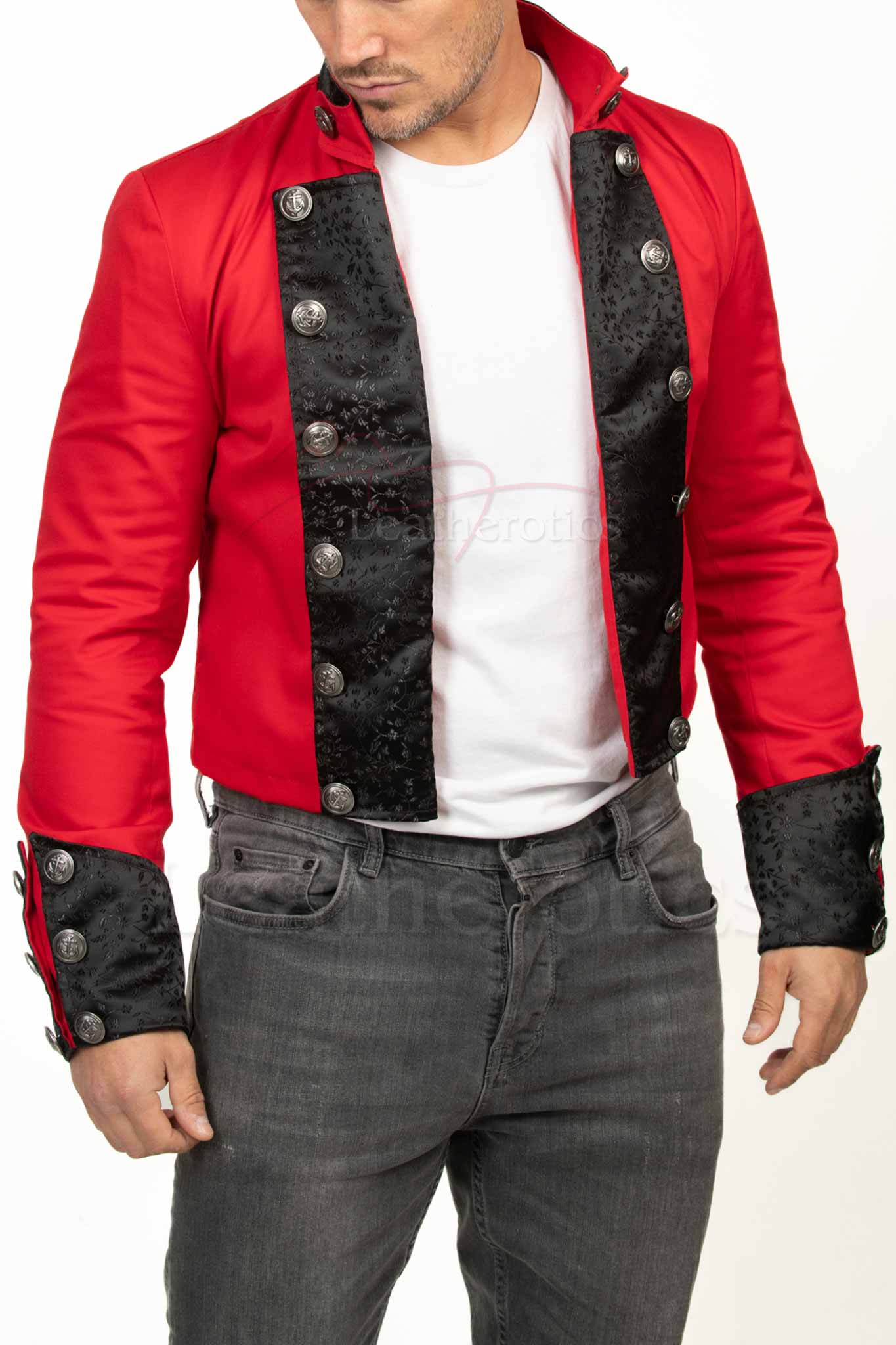 The Men's Red Cotton Bolero Jacket is a striking combination of modern tailoring and elegant detail.